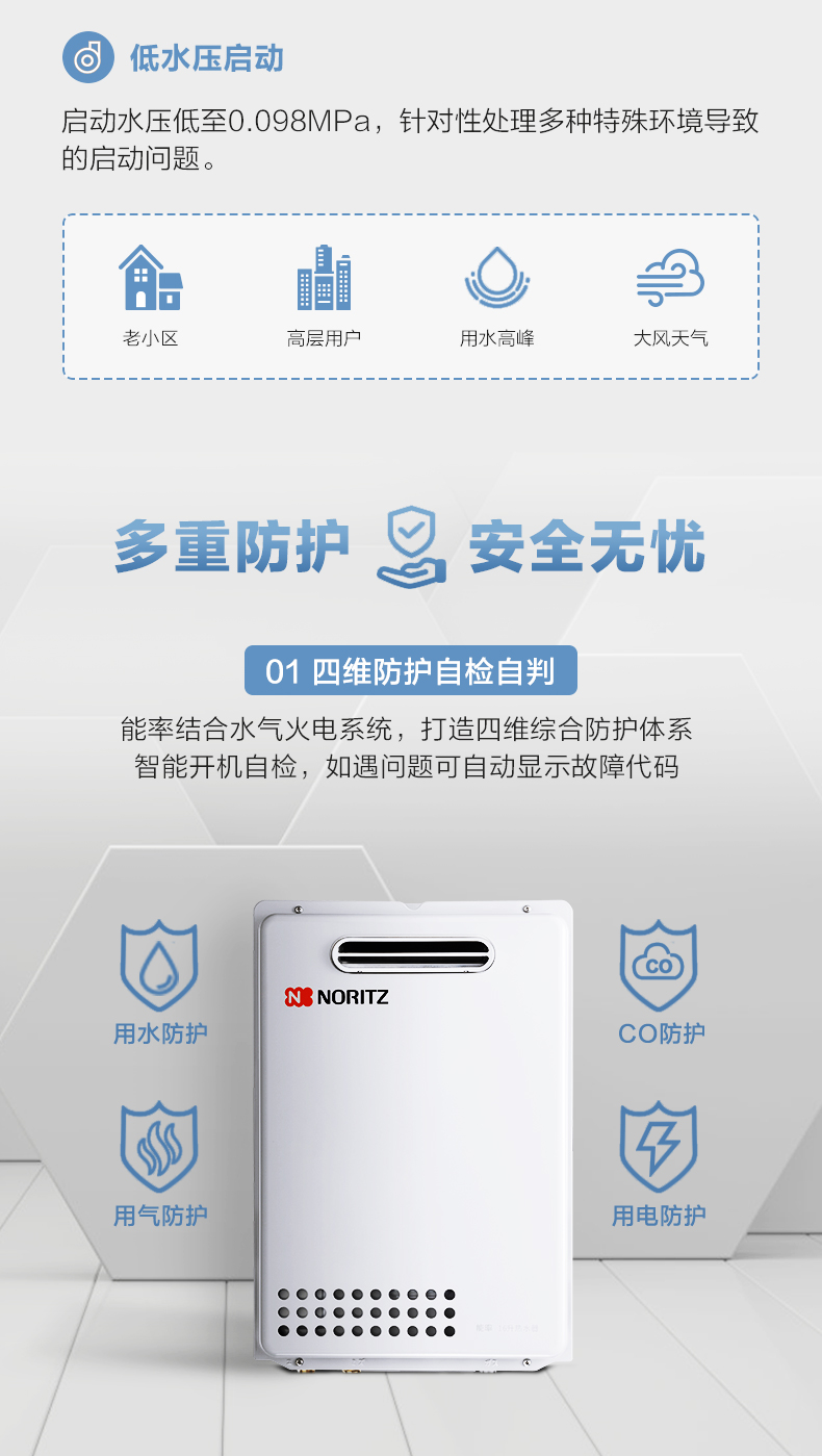 安全装置:熄火保护、余火保护、防空烧安全保护、停电时安全保护、防过热保护、防过电流保护、防冻结保护、过压保护、防沸腾保护、定时停机保护等